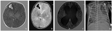 A、B:例1患儿头颅磁共振成像示右额叶出血(亚急性期),双侧侧脑室旁微出血灶,双侧小脑半球异常信号,双侧基底节区异常信号;C:例2患儿头颅磁共振成像示双侧脑室扩张,重度脑积水;D:例4患儿X线胸片示两肺野透过度减低,可见多发斑片致密影。