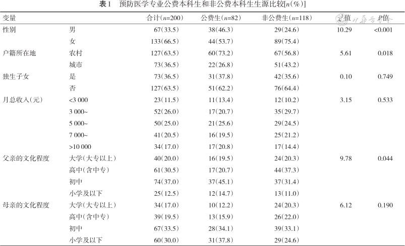 | 变量 | 合计(n=200) | 公费生(n=82) | 非公费生(n=118) | χ2 值 | P值 | |