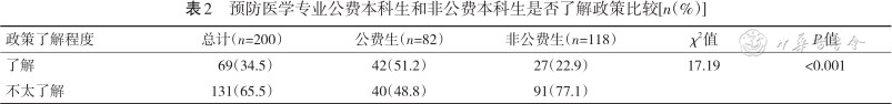 在预防医学专业公费本科生和非公费本科生中,了解山东省有预防医学专业公费本科生政策的学生有69人(34.5%),其中公费生42人(51.2%)、非公费生27人(22.9%)。这说明82名预防医学专业公费本科生中有40名学生是在不太了解公费医学生政策的前提下报考的。预防医学专业公费本科生和非公费本科生在政策了解方面的差异有统计学意义(χ2=17.19,P<0.001)(表2)。