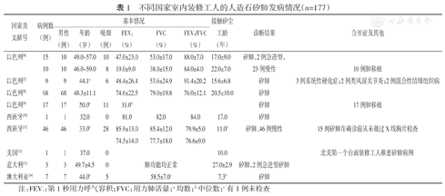 | 以色列[6] | 15 | 10 | 49.0~57.0 | 10 | 47.0±23.0 | 53.0±17.0 | 88.0±7.0 | 17.0±9.0 | 矽肺,2例急进型,23例慢性 | |