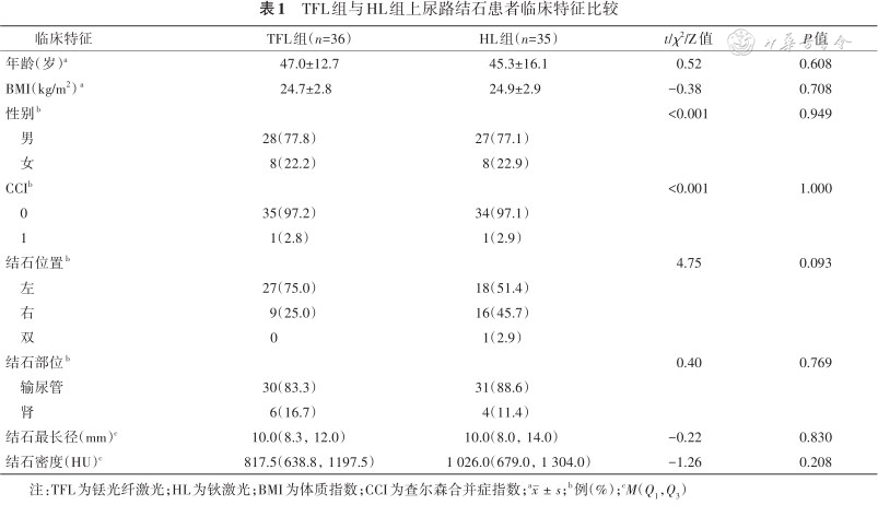 纳入的76例患者中,2例因术中发现输尿管狭窄无法行输尿管镜手术治疗,1例因术中发现结石已自行排出不需进行碎石治疗,2例未完成随访复查。最终收集71例患者资料,其中男性55例,女性16例;年龄(45.7±14.1)岁。TFL组36例,HL组35例。TFL组与HL组患者的年龄、BMI、性别比例、CCI、结石位置、结石部位、结石大小、结石密度的差异均无统计学意义(均P>0.05,表1)。
