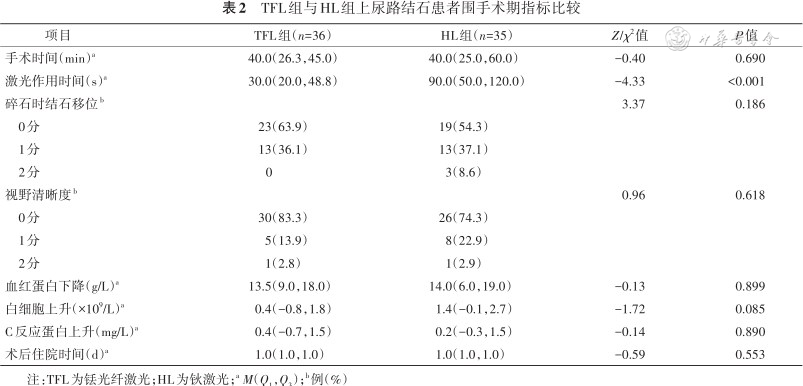TFL组和HL组患者均顺利完成手术。由表2可见,TFL组与HL组患者的手术时间,碎石时结石移位,视野清晰度,血红蛋白、白细胞和C反应蛋白的变化差值以及术后住院时间的差异均无统计学意义(均P>0.05)。TFL组患者的激光作用时间短于HL组(P<0.001)。两组患者均未发生术中并发症。