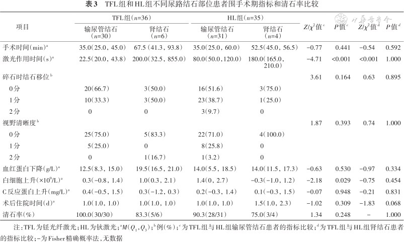 注:TFL为铥光纤激光;HL为钬激光;aM(Q1,Q3);b例(%);c为TFL组与HL组输尿管结石患者的指标比较;d为TFL组与HL组肾结石患者的指标比较;-为Fisher精确概率法,无数据
