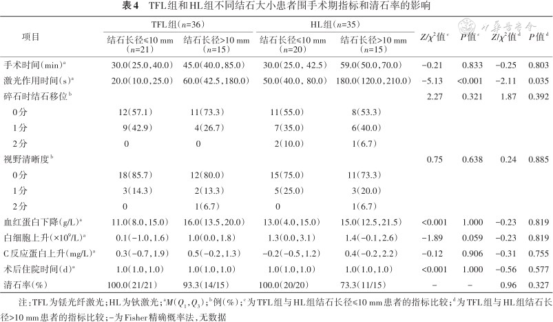 由表4可见,对于长径≤10 mm的结石,TFL组与HL组手术时间,碎石时结石移位,视野清晰度,血红蛋白、白细胞、C反应蛋白的变化差值以及术后住院时间的差异均无统计学意义(均P>0.05);TFL组激光作用时间为短于HL组(P<0.001);TFL组和HL组清石率均为100.0%。对于长径>10 mm的结石,TFL组与HL组手术时间,碎石时结石移位,视野清晰度,血红蛋白、白细胞、C反应蛋白的变化差值以及术后住院时间的差异均无统计学意义(均P>0.05);TFL组激光作用时间短于HL组(P=0.035);TFL组和HL组清石率差异无统计学意义(P=0.327)。