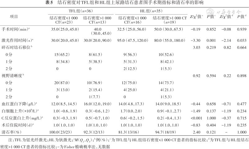 由表5可见,对于密度≤1 000 CT的结石,TFL组与HL组手术时间,碎石时结石移位,视野清晰度,血红蛋白、白细胞、C反应蛋白的变化差值以及术后住院时间的差异均无统计学意义(均P>0.05);TFL组激光作用时间短于HL组(P=0.001);TFL组和HL组清石率差异无统计学意义(P=0.121)。对于密度>1 000 CT的结石,TFL组与HL组手术时间,碎石时结石移位,视野清晰度,血红蛋白、白细胞、C反应蛋白的变化差值以及术后住院时间的差异均无统计学意义(均P>0.05);TFL组激光作用时间短于HL组(P=0.033);TFL组和HL组清石率差异无统计学意义(P=1.000)。