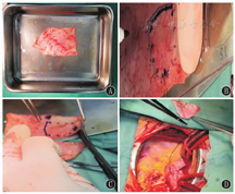 全身麻醉,食管超声心动图(TEE)再次评估主动脉瓣病变情况。自体心包准备:胸骨正中切口,打开心包,剪取部分心包,充分剔除表面多余组织,以丝线牵引,使其充分展开,置于50 mL的6 g/L戊二醛溶液的盘中,浸泡10 min,然后用生理盐水清洗3次,用主动脉瓣OzakiI模具,根据患儿的年龄、体重选择相应大小的模具孔,用记号笔标记好相应大小的心包片,沿着标记裁剪,有时根据自身保留下的瓣膜情况,适当裁剪,裁剪好的补片用于瓣叶成形(图1)。