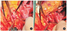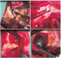 主动脉瓣成形:常规建立体外循环,阻断升主动脉后,先顺行灌注心肌保护液;如主动脉瓣关闭不全切开主动脉根部后,经左、右冠状动脉开口分别灌注心肌保护液。探查主动脉瓣,明确主动脉瓣解剖结构异常(图2A),探查后,如有融合部黏连狭窄,先将黏连瓣膜交界切开(图2B),切开功能性两瓣叶的切除融合主动脉瓣的嵴,削薄增厚的主动脉瓣叶,将自体心包补片连续缝合到主动脉瓣削薄后的瓣叶上,达到扩大瓣叶的效果,仔细检查3个瓣叶大小、高度、形态(图2C),后探条测试主动脉瓣环(图2D),测量瓣口是否狭窄,瓣叶交界固定于主动脉壁上;关闭主动脉切口。如果一个瓣膜发育小,完全无功能,也可在原瓣膜的基础上行单瓣叶的扩大,接近重建主动脉瓣,补片(图1D)行单瓣叶的重建,沿着瓣膜残缘缝合自体心包补片,瓣叶交界固定于主动脉壁上(图3A),最后检查瓣膜形态,包括瓣叶大小、对合高度(图3B)。