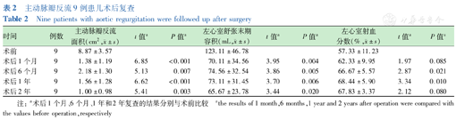 ±s表示。同一患儿术前和术后1个月、6个月、1年和2年的主动脉瓣最大跨瓣压差、舒张期主动脉瓣下反流面积、左心室舒张末期容积(LVEDV)和LVEF的比较采用配对t检验,检验水准α=0.05,P<0.05为差异有统计学意义。