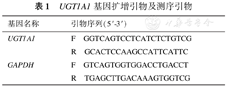 采用全血DNA提取试剂盒(上海生工生物工程股份有限公司)提取DNA,按照UGT1A1基因第1外显子的特异序列及空间结构设计引物(引物由上海生工生物工程股份有限公司合成),进行PCR扩增,PCR反应体系:1 μL DNA模板,0.5 μL上游引物,0.5 μL下游引物,0.5 μL dNTP,2.5 μL Taq Buffer,0.2 μL DNA聚合酶,去离子水补充至25 μL。反应条件为95 ℃预变性3 min,然后进行35个PCR循环(94 ℃变性30 s;58 ℃退火30 s;72 ℃延伸60 s),最后72 ℃延伸10 min。用1.5%琼脂糖凝胶电泳检测PCR产物是否合格,将合格的DNA产物送检生工生物工程进行测序,分析突变。UGT1A1基因扩增引物及测序引物见表1。