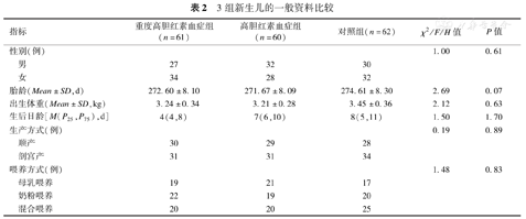 | 项目 | 重度高胆红素血症组(n=61) | 高胆红素血症组(n=60) | 对照组(n=62) | χ2值 | P值 |