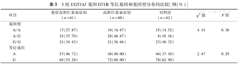 3组UGT1A1基因G71R等位基因和基因型分布的比较[例(%)]