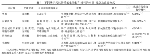 不同基于天然物质的生物打印材料的来源、特点及改进方式