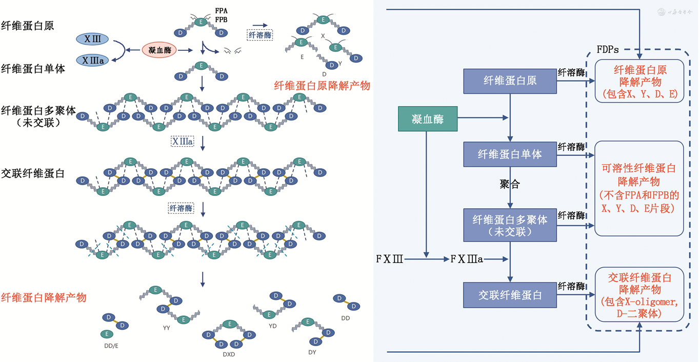 D-二聚体是交联纤维蛋白的降解产物。纤维蛋白原在凝血酶的作用下,形成纤维蛋白单体(fibrin monomer,FM),FM以半交错、重叠的方式自发地聚合,形成不稳定的可溶性纤维蛋白多聚体,进而在FⅩⅢ a催化下共价交联,形成交联纤维蛋白多聚体[10, 11],即不可溶的纤维蛋白。交联纤维蛋白多聚体在纤溶酶的作用下降解生成大量复杂的长片段X-寡聚体(X-oligomer),这些长片段继续分解生成含有由两个共价结合的D-结构域(D=D,相当于D-二聚体)的大小不一的片段组合,其最终末产物为D=D/E[3,9,12]。