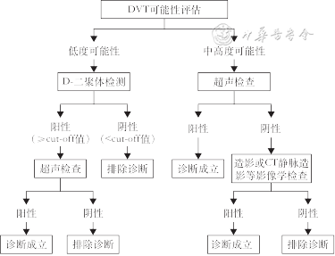 推荐意见5:(1)对于无明显血栓发生诱因、临床症状和体征不典型、Wells评分为低度临床可能的患者,高敏感度D-二聚体定量检测阴性的结果可排除DVT,阳性者推荐进一步行血管超声检查;对于血栓发病因素明显、症状体征典型、Wells评分为中、高度可能的患者,首选血管超声检查(强推荐);(2)D-二聚体应满足推荐意见2中的要求(强推荐)。