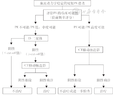 推荐意见6:(1)应基于临床经验或临床可能性(Wells评分或校正的Geneva评分)联合D-二聚体检测进行急性PE的筛查。临床评估中、低度可能的患者,高敏感度D-二聚体定量检测结果阴性可除外PE,如D-二聚体阳性,建议进一步行确诊检查,如CTPA(强推荐);(2)D-二聚体应满足推荐意见2中的要求(强推荐)。