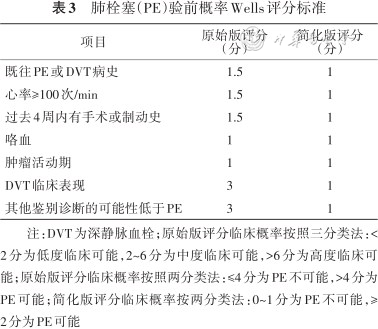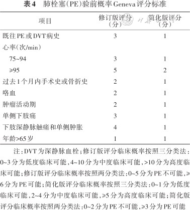 注:DVT为深静脉血栓;修订版评分临床概率按照三分类法:0~3分为低度临床可能,4~10分为中度临床可能,>10分为高度临床可能;修订版评分临床概率按照两分类法:0~5分为PE不可能,≥6分为PE可能;简化版评分临床概率按照三分类法:0~1分为低度临床可能,2~4分为中度临床可能,≥5分为高度临床可能;简化版评分临床概率按照两分类法:0~2分为PE不可能,≥3分为PE可能