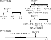 (2)研究对象在多个时刻多次纳入研究:在长期研究中,研究对象可能有多次机会符合纳入排除标准。例如,在一项模拟目标试验中比较过去2年内没有慢性病史且未使用激素治疗的绝经后妇女中开始与未开始激素治疗的结局差异,在一段时间内(如50~55岁),从未接受过治疗的女性,50岁时未接受过治疗可以纳入对照组,51岁时同样符合纳入排除标准可以纳入对照组,换言之,这位女性有多个时间符合零时刻定义。对于这种情况有2种处理方法:第一种,选取某个时间为零时刻开始试验,即零时刻确定的第一种策略,例如在50岁时开始;第二种,嵌套多个试验,在固定的周期或在每次符合纳入排除标准时均开始一个新的试验。从统计学角度分析,第二种策略比第一种的效能更高[9]。但是,由于同一个体包含在多个试验中,因此需要对方差估计量进行适当调整。