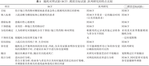 9. 模拟目标试验的特点:为更直观阐述模拟目标试验的特点,本研究以他汀类药物对糖尿病患者患心肌梗死预后的影响为例,比较RCT、模拟目标试验、队列研究在研究设计阶段存在的差异。见表1。