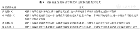 | 中等质量(B) | 对估计的效应值确信程度中等,估计值有可能接近真实值,但仍存在二者不相同的可能性,进一步研究有可能改变该估计效应值的可信度 |