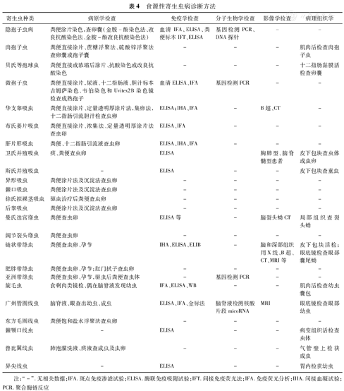 实验室检查包括特异性和非特异性两大类。病原学、免疫学和分子生物学等可检查与寄生虫相关的虫体、抗原(抗体)及核酸,对寄生虫感染的诊断具有重要意义,血液常规、生化、尿液及影像学检查,虽不具有特异性,但有辅助诊断价值,见表4。