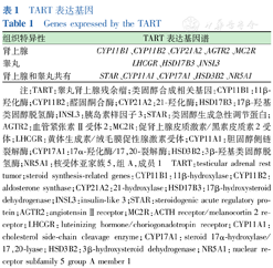 注:TART:睾丸肾上腺残余瘤;类固醇合成相关基因:CYP11B1:11β-羟化酶;CYP11B2:醛固酮合酶;CYP21A2:21-羟化酶;HSD17B3:17β-羟基类固醇脱氢酶;INSL3:胰岛素样因子3;STAR:类固醇生成急性调节蛋白;AGTR2:血管紧张素Ⅱ受体2;MC2R:促肾上腺皮质激素/黑素皮质素2受体;LHCGR:黄体生成素/绒毛膜促性腺激素受体;CYP11A1:胆固醇侧链裂解酶;CYP17A1:17α-羟化酶/17,20-裂解酶;HSD3B2:3β-羟基类固醇脱氢酶;NR5A1:核受体亚家族5,组A,成员1 TART:testicular adrenal rest tumor;steroid synthesis-related genes:CYP11B1:11β-hydroxylase;CYP11B2:aldosterone synthase;CYP21A2:21-hydroxylase;HSD17B3:17β-hydroxysteroid dehydrogenase;INSL3:insulin-like 3;STAR:steroidogenic acute regulatory protein;AGTR2:angiotensin Ⅱ receptor;MC2R:ACTH receptor/melanocortin 2 receptor;LHCGR:luteinizing hormone/choriogonadotropin receptor;CYP11A1:cholesterol side-chain cleavage enzyme;CYP17A1:steroid 17α-hydroxylase/17,20-lyase;HSD3B2:3β-hydroxysteroid dehydrogenase;NR5A1:nuclear receptor subfamily 5 group A member 1