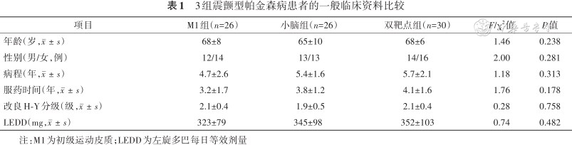 | 项目 | M1组(n=26) | 小脑组(n=26) | 双靶点组(n=30) | F/χ2值 | P值 |