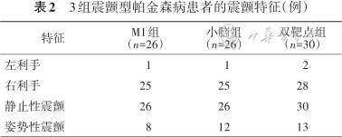 82例震颤型PD患者中男39例,女43例,年龄(67±8)岁。3组患者在年龄、性别、教育程度、服药时间及H-Y分级等方面比较差异无统计学意义,具有可比性(表1),震颤特征见表2。