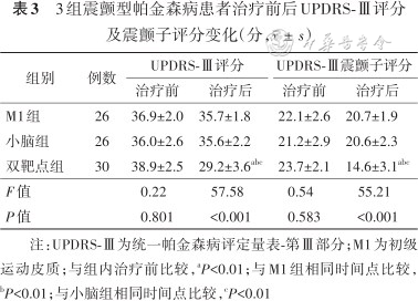 所有患者均完成整个治疗。3组治疗结束后,UPDRS-Ⅲ评分变化如表3所示,治疗前3组患者UPDRS-Ⅲ评分组间差异无统计学意义(P=0.801),治疗后差异有统计学意义(P<0.001)。治疗后双靶点组UPDRS-Ⅲ评分与治疗前比较有明显降低(t=22.49,P<0.01),M1组、小脑组UPDRS-Ⅲ评分与治疗前比较变化不明显(均P>0.05)。进一步分析,UPDRS-Ⅲ中的震颤子评分,治疗后双靶点组评分显著低于治疗前(t=23.34,P<0.01),而M1组、小脑组评分与治疗前比较变化不明显(均P>0.05)。同时,治疗后双靶点组UPDRS-Ⅲ评分及震颤子评分显著低于M1组及小脑组(均P<0.01)。
