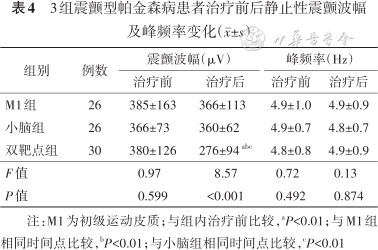 3组经rTMS治疗结束后,经肌电图震颤分析比较,治疗前3组患者静止性震颤的波幅组间差异无统计学意义(P=0.599),治疗后差异有统计学意义(P<0.001)。治疗后双靶点组静止性震颤的波幅与治疗前比较有明显降低(t=4.54,P<0.01),M1组、小脑组震颤的波幅与治疗前比较变化不明显(均P>0.05)。进一步分析,治疗后双靶点组静止性震颤的波幅显著低于M1组及小脑组(均P<0.01)。各组治疗前后的静止性震颤峰频率差异无统计学意义(均P>0.05)(表4)。
