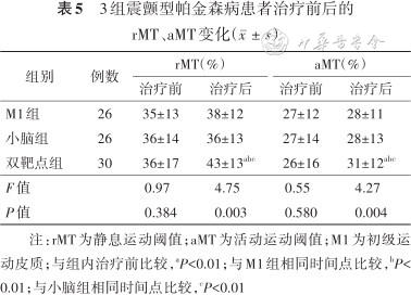 3组震颤型帕金森病患者治疗前后的rMT、aMT变化()