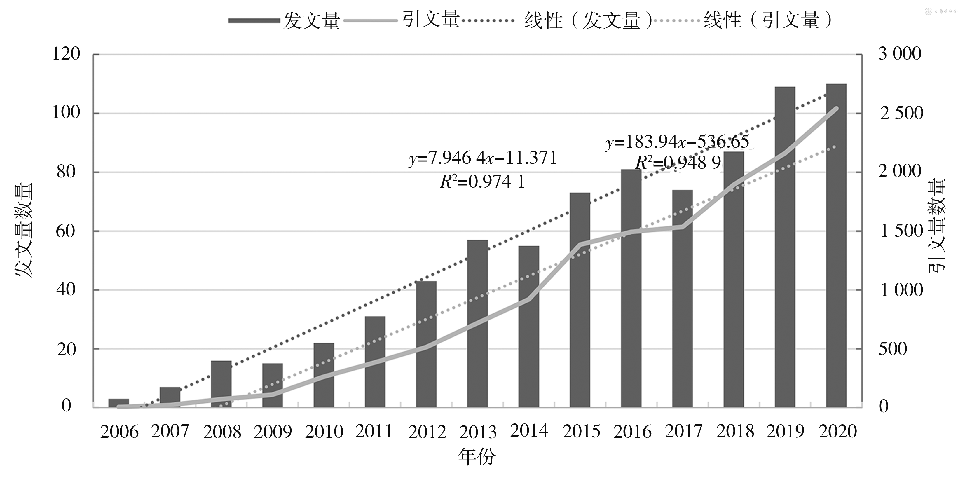 年发文量和引文量呈现出研究领域的研究数量随年份变化趋势。图 1显示了模拟训练向临床能力转化研究的年发文量和引文量的时间演进特征。2006年至2020年,发文量共计783篇,年发文量增长30倍,引文量从6篇增长到2 542篇。发文量和引文量随年份呈线性增长(y=7.946 4x-11.371,R2=0.974 1;y=183.94x-536.65,R2=0.948 9),增长率逐年提高。这表明,模拟训练到临床能力的转化技能研究热度和关注度在不断提高。