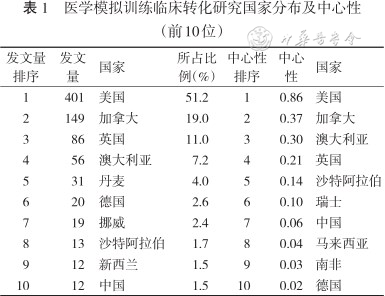 医学模拟训练临床转化研究国家分布及中心性(前10位)