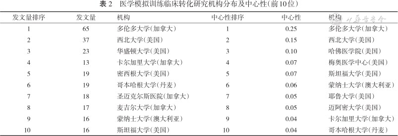 医学模拟训练临床转化研究机构分布及中心性(前10位)
