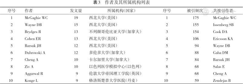 通过比较发文数量前10名的作者及他们所属机构(表3)发现,发文量排名第一的是来自美国西北大学的McGaghie WC教授。其主要方向为模拟医学的转化研究,注重临床患者治疗结果的评价,包括急救重症医学、心脏骤停急救处理等技能;并在该领域发表19篇文献,近两年将健康突发事件的应急处置纳入实习医师模拟培训课程之中[8, 9]。Wayne DB教授(n=15)及Brydges R教授(n=13)紧随其后,Wayne DB与McGaghie WC教授的研究方向基本重合。而Brydges R教授与Dubrowski A(n=12)来自同一个团队,在临床腹腔镜操作及静脉导管插入术技能模拟训练临床转化上取得了显著的成果。