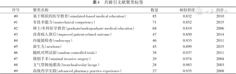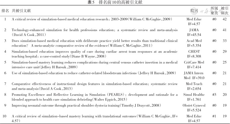 通过使用CiteSpace对文献进行共被引分析,可以看出国内外模拟技能训练临床转化研究呈现出清晰的知识组群划分。通过CiteSpace的cluster explorer功能得到表 4。用聚类大小表示文献的数量,用同质性来衡量同聚类下各个文献的相似程度。表 4中的共被引文献主题聚类包括#0基于模拟的医学教育,#1非操作技能,#2硕士/本科医学教育,#4内镜检查,#5新生儿,#6随机对照试验,#7微创手术,#8支气管肺泡灌洗等,反映出临床技能转化实现的技能与学科领域,并且以#3改善病人预后作为评价指标。表5显示了排名前10的高被引文献,这10篇文献均是模拟技能训练临床转化的经典文献。最高共被引的10篇文献中,8篇文献来自聚类#0基于模拟的医学教育。这表明,模拟训练在临床技能中的转化已成为当前模拟医学教育的一大热点研究方向。