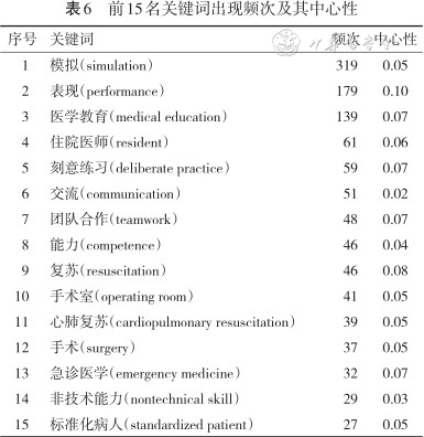 本研究应用CiteSpaceV软件对模拟技能训练临床转化效果的研究热点进行分析,并绘制关键词可视化共现知识图谱。该图谱共包含437个关键词,其中前15个关键词的出现频次范围为41~319,中心性范围为0.03~0.10。根据高频关键词贡献图谱,可以发现该研究热点主要集中在训练模型、临床转化效果、具体学科、专业技能等方面(表6)。