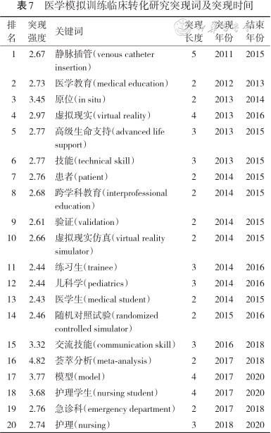 利用CiteSpace的词频增长检测算法,通过考察词频的时间分布和变动趋势,发现高频突现词,从而对研究前沿进行侦测。表7展示了2011至2020年近10年来20个高突现关键词及其突现时间段。其中,“荟萃分析”具有最高突现值,“静脉插管”突现时间最长;“交流技能”“护理”“急诊”“模型”“荟萃分析”“随机对照试验”等词突现时间晚于2014年。这表明护理、急诊学科及交流能力等非操作性技能模拟训练临床转化代表着该研究的前沿与趋势;同时,随机对照试验及荟萃分析为该领域研究的主要手段。