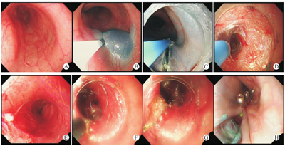 ①患儿均行气管插管全身麻醉。②经口胃镜进镜,清洁食管、胃内。③选定切口位置(图1A),于该处用生理盐水、亚甲蓝及肾上腺素的混合液(50 ml生理盐水加1 mg肾上腺素及0.5 ml亚甲蓝注射液)进行黏膜下注射使黏膜隆起(图1B),建立长约1.5~2.0 cm纵行黏膜隧道开口(图1C)。④将胃镜经切口置入,逐步纵行往下剥离黏膜下层至食管胃连接部(esophagogastric junction,EGJ)远端(图1D、1E)。⑤切开环形肌层(图1F、1G)。⑥钛夹封闭隧道口(图1H)。