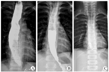 患儿术中、术后监测血压、心率、血氧饱和度等生命体征,观察有无发热、皮下气肿等并发症或其他不良反应。住院期间院内随访,术后1个月、3个月定期门诊随访并记录患儿Eckardt评分及定时钡餐造影(timed barium esophagram,TBE)评估治疗有效性[7,8]。所有患儿均在术前及术后定期随访时行TBE检查,记录患儿检查时1、2、5 min钡剂的高度。
