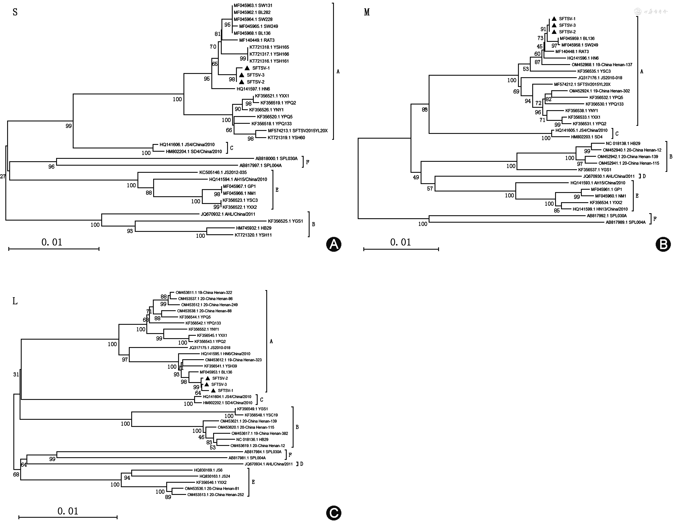 对首发病例、续发病例及密切接触者血清样本进行RT-PCR检测,其中首发病例、续发病例核酸检测结果均为阳性,平均Ct值为29.56±2.93,密切接触者的核酸检测结果均为阴性。由于第二起聚集性病例没有收集到样本进行进一步检测,仅第一起聚集性病例样本进行测序。经构建系统进化树分析,所测序列S、M、L片段均在A型分支上,与河南毒株BL136亲缘关系较近(图1)。
