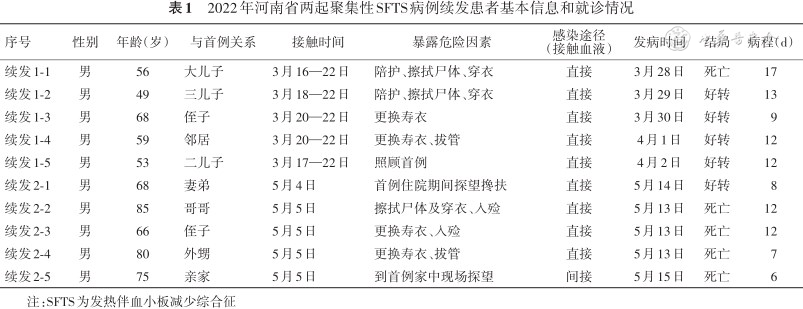 2022年河南省两起聚集性SFTS病例续发患者基本信息和就诊情况