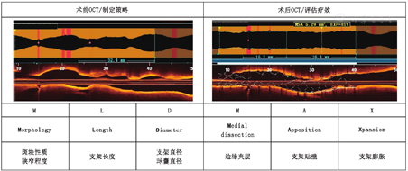 OCT的MLD-MAX评估流程[术前通过OCT制定PCI策略,M (Morphology,斑块性质及狭窄程度)、L (Length,支架长度)和D (Diameter,支架直径及球囊直径);术后通过OCT评估PCI疗效,包括M (Medial dissection,边缘夹层)、A (Apposition,支架贴壁)和X (Xpansion,支架膨胀)]可以协助术者优化PCI治疗,包括术前评估斑块性质、狭窄程度、病变长度、球囊和支架的选择,到术后支架膨胀、贴壁和边缘夹层的评估,该图全面总结了OCT指导优化PCI的经典过程(图3)。