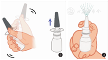 垂直平面内摇动喷雾,使药物充分混匀,喷嘴远离面部,特别是眼部,按图示握住装置,向下按压,排除喷雾泵内空气,直到装置喷雾正常为止。按压数次,直至看到细密的喷雾(图3)。