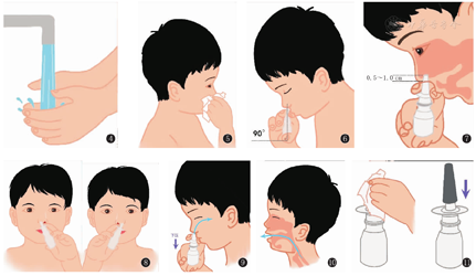 (1)清洗双手(图4);(2)如果鼻腔内有大量黏脓涕,通过交叉擤鼻清除[50](图5);(3)每次喷鼻前,应先将药液摇匀,确保喷出有效喷雾;(4)头部微微向前倾斜,保持瓶体重心与地面垂直,如果未保持垂直,可能导致喷雾不完全或者不喷雾(图6);(5)将喷嘴插入鼻孔中0.5~1.0 cm处(图7);(6)将喷雾剂朝向外侧或一侧喷,大概45°,远离鼻中部(鼻中隔),朝向眼睛的外部部分或那一侧的耳朵顶部(用右手喷洒左鼻孔,用左手喷洒右鼻孔,使喷头远离鼻中隔,图8);(7)轻轻吸气的同时喷出药物,注意不要用力吸,防止用力过度吸入口腔(图9);(8)用口呼吸,不要立即擤鼻涕(图10);(9)如果每个鼻孔需要2喷,间隔2~3 s后再喷下一喷;(10)用清洁的布或纸巾擦净喷嘴,盖上防尘帽(图11)。