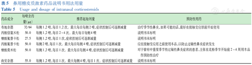 鼻用激素一般在使用后3~5 h起效,达到最大疗效可能长达2周[32]。症状缓解过程中增加剂量不能起到更好作用[33]。同时注意症状缓解后不能立即停药。用药具体推荐可参照药品说明书(表5)。