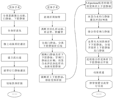 具体手术流程如下:将动物带至手术室,面罩下异氟烷麻醉诱导后予以外周静脉置管,气管插管,维持麻醉及呼吸机辅助呼吸;颈内静脉置管,动脉置管监测有创血压。手术区域备皮、消毒;取上腹部奔驰样切口,逐层入腹;游离肝脏周围韧带;游离左右肝动脉、肝固有动脉及肝总动脉和胃十二场动脉起始部,结扎离断左右肝动脉;离断并结扎肝总管、胆囊管;分离门静脉,上至左右分叉处、下至肝总动脉边缘;分离下腔静脉肝后端,小心分离肾上腺,端扎肾上腺静脉;阻断门静脉及肝下下腔静脉后,穿刺门静脉近肝侧,用蛋白水冲洗驱赶肝内血液至腔静脉,阻断肝上下腔静脉,分别离断门静脉、肝上下腔静脉及肝下下腔静脉;充分止血;将肝上下腔静脉与肝静脉残端成型,5-0 prolene线连续缝合供受体肝上下腔静脉;冰蛋白水经门静脉灌注冲洗UW液;7-0 prolene线连续缝合供受体门静脉;血管夹夹闭供体肝下下腔静脉,分别开放肝上下腔静脉及门静脉,温水复温;止血后,6-0 prolene线连续缝合供受体肝下下腔静脉,并开放;应用供体腹腔干与脾动脉成型的动脉瓣和受体肝固有动脉与胃十二指肠动脉成型的动脉瓣,8-0 prolene线连续缝合;胆管留置引流管行外引流;充分止血后逐层关腹。