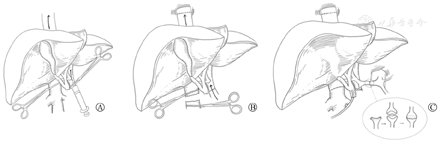 既往的异种原位移植手术中,一般是先完成肝上腔静脉的吻合,再吻合肝下腔静脉和门静脉;进行肝脏再灌注后,将供体肝动脉与受体肝动脉端端吻合;最后完成供、受体胆管的端端吻合[6,7,8]。在此基础上,本研究团队经过一系列实践,总结出以下3点改进方案:(1)为减少术中出血,在阻断门静脉及肝下下腔静脉后,穿刺门静脉近肝侧,用蛋白水冲洗驱赶肝内血液至腔静脉,然后阻断肝上下腔静脉,切除受体肝脏,将受体肝脏内残余血液回收至受体体内(图2A);(2)为缩短无肝期,在吻合完成供受体肝上下腔静脉及门静脉后即开放,再吻合肝下下腔静脉(图2B);(3)应用供体腹腔干与脾动脉做血管瓣与受体肝固有动脉与胃十二指肠动脉做血管瓣吻合(图2C)。