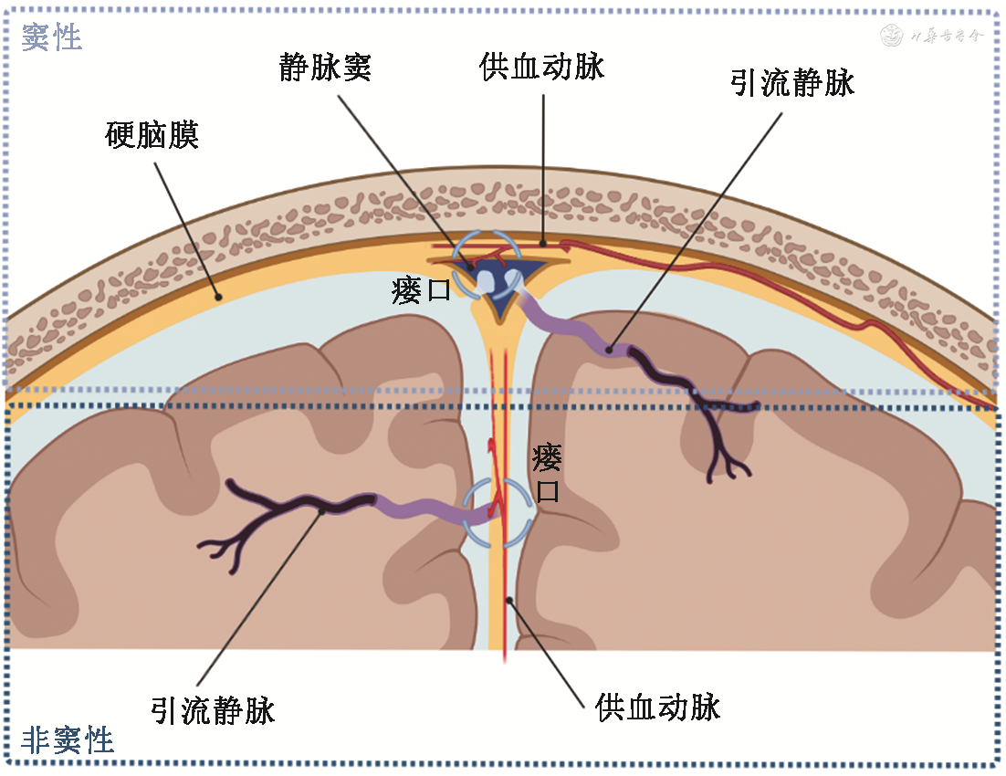 DAVF传统的分型包括Borden分型和Cognard分型。Borden分型根据不同静脉引流情况将DAVF分为三种类型:Ⅰ型,流入硬脑膜静脉窦或脑膜静脉;Ⅱ型,流入硬脑膜静脉窦+皮质静脉回流;Ⅲ型,仅限皮质静脉回流[6]。Cognard分型则将DAVF分为:Ⅰ型,顺行引流至硬脑膜静脉窦;Ⅱa型,逆行引流至硬脑膜静脉窦;Ⅱb型,顺行引流至硬脑膜静脉窦+皮质静脉回流;Ⅱa+b型,逆行引流至硬脑膜静脉窦+皮质静脉回流;Ⅲ型,皮质静脉回流不伴静脉扩张型;Ⅳ型,皮质静脉回流伴静脉扩张型;Ⅴ型,脊髓髓周静脉引流[7]。D′Aliberti等[8]根据DAVF瘘口位置提出了有助于手术方式选择的简化二分类方法:窦性DAVF,即硬脑膜动脉直接分流到硬脑膜窦;非窦性DAVF,即瘘管引流至大脑静脉,不与静脉窦沟通(图1)。目前,经动脉或静脉途径的血管介入栓塞是一线治疗方法,可以降低治疗后新发血管畸形,保留部分静脉系统功能[9]。