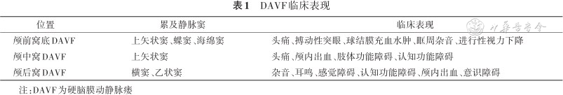 DAVF的发病原因尚不完全清楚,目前认为此病可能与创伤、肿瘤、炎性反应、雌激素水平变化、血液高凝状态、静脉窦炎或血栓、血管肌纤维发育不良、颅脑损伤等多种因素有关[2]。患者临床表现大多为持续性颅内杂音、头痛、颅内出血,少数可出现癫痫发作、轻偏瘫、失语等[3, 4](表1)。海绵窦硬脑膜动静脉畸形患者可出现额眶或球后疼痛、突眼、视力下降、复视、眼球运动神经障碍等症状[5]。