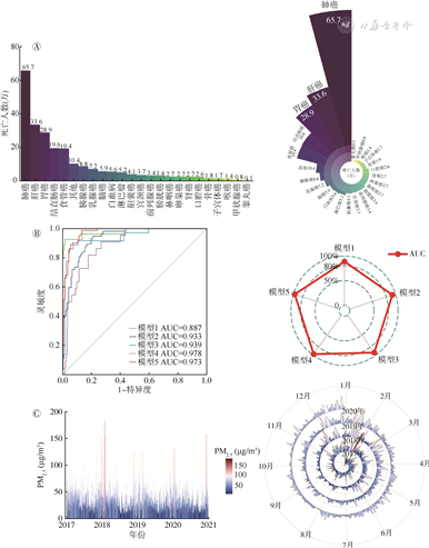 (1)条形图的极坐标变换:条形图经极坐标变换后,将条形不同高度转化为饼图不同扇形角度,以各角度的大小体现数值大小;以此为基础,结合条形图、饼图特点,设置相同的扇形角度,用扇形的半径长度代替数值的大小,衍生为著名的玫瑰图。以2016年中国癌症死亡人数数据为例,展示条形图-饼图的极坐标变化(图3A),图形变换后,可清楚观察到死亡人数排名靠前的癌症(肺癌、肝癌和胃癌),对视觉产生更大的吸引力[16]。
